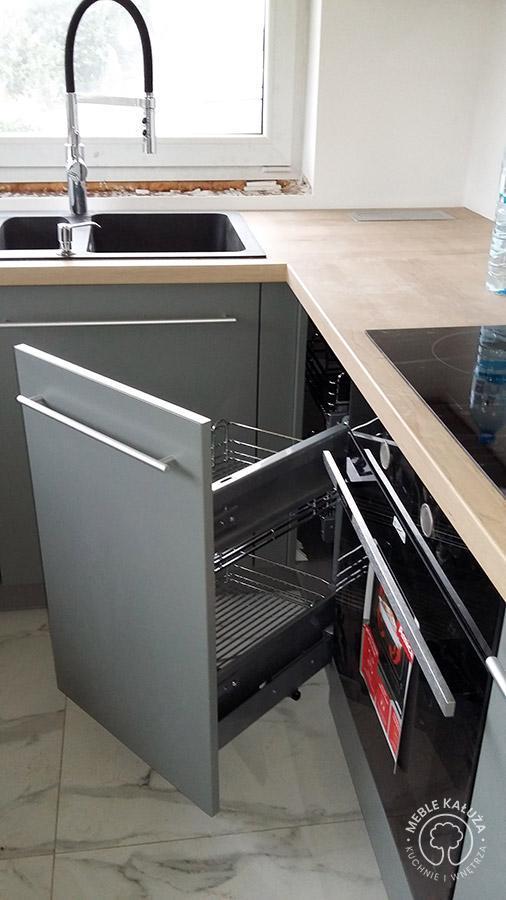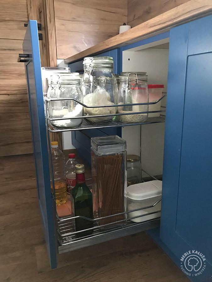 Przechowywanie naczyń oraz żywności w głębokich szafkach i na mało dostępnych półkach, zostało zastąpione przez wygodne szuflady oraz wysuwane kosze cargo.